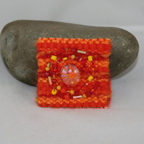 A lovely orange glass pebble, stitched to a hand-woven background, forms the focus for this brooch design.