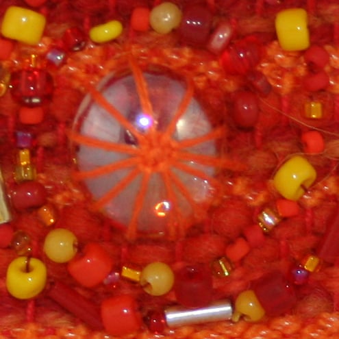 The glass pebble with a lovely iridescent effect, formed the inspiration for this design. The background has been woven from a variety of yarns, chosen to enhance the colours in the glass. A swirl of beads, in a similar blend of colours, is stitched to enfold the pebble.