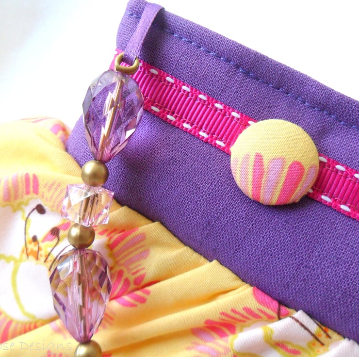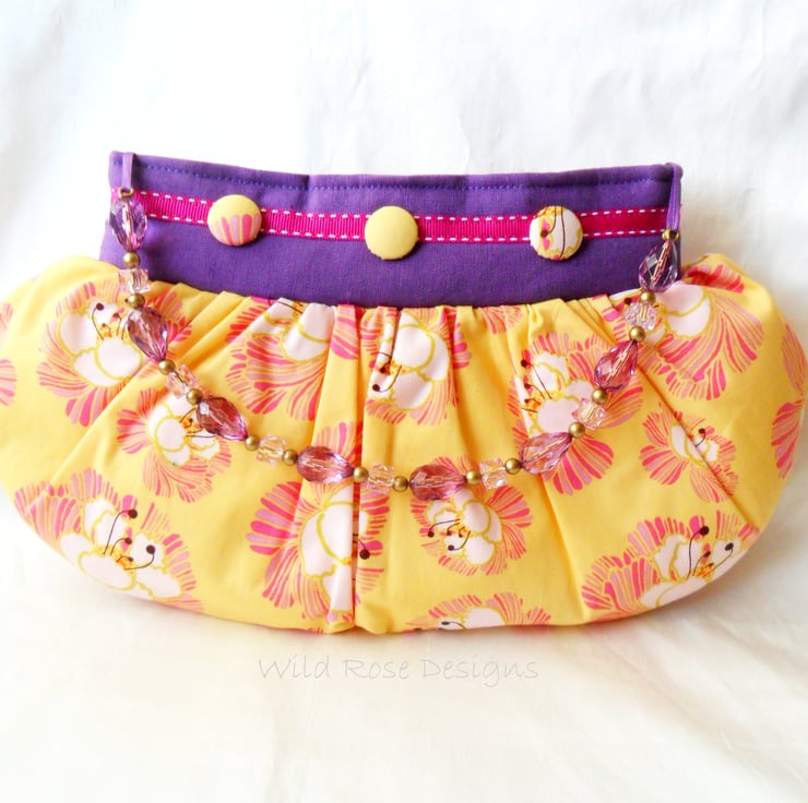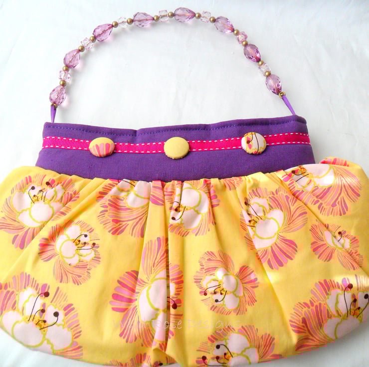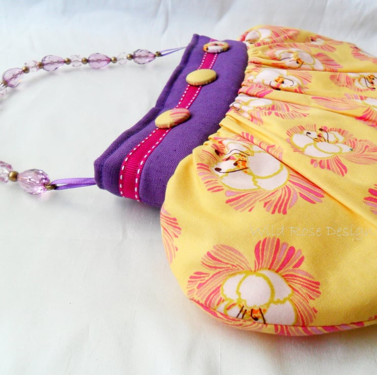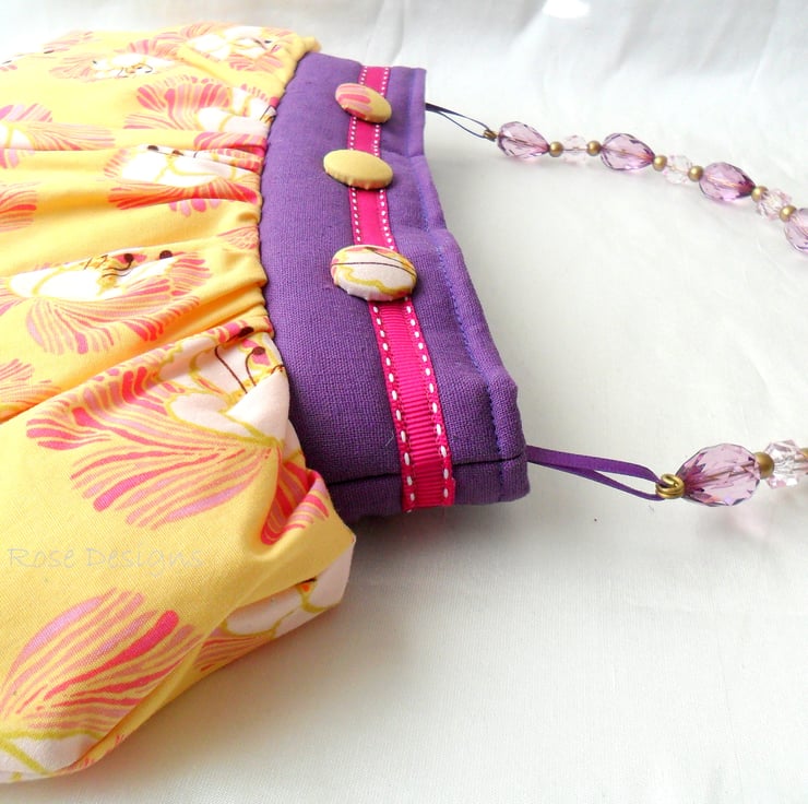 This one of a kind bag is made from a lovely yellow and pink floral cotton print with a contrasting lilac band, and is the perfect size to take to a Wedding or Summer event. The main body of the bag is gathered onto a lilac cotton band that is trimmed with a pink gross grain ribbon and fabric covered buttons. The bag is lined with ivory satin and it has two inside pockets that will fit a phone and a small mirror. It has an acrylic bead handle and closes with a magnetic snap.
