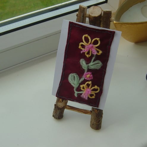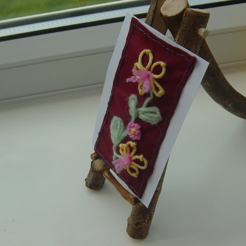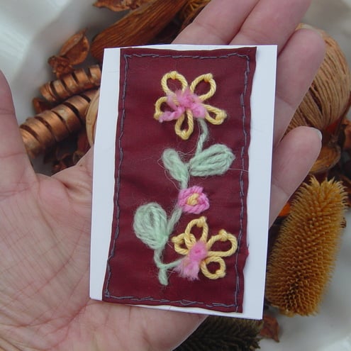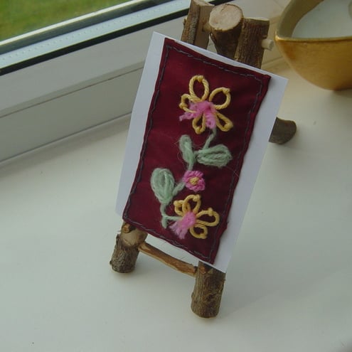 Floral Strip is a mixed media ACEO, featuring embroidery on burgundy material, which is then sewn to white card, and then sewn to an additional backing card in all four corners, to ensure minimal cotton and yarn workings can be seen from behind.