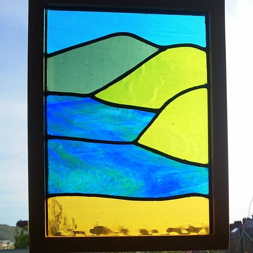 This panel is made using traditional leading techniques and gorgeous green, blue, yellow and turquoise glass to really reflect the clear blue seas there. The panel is framed in a reclaimed tulip tree wooden frame which I have custom made by a local carpenter