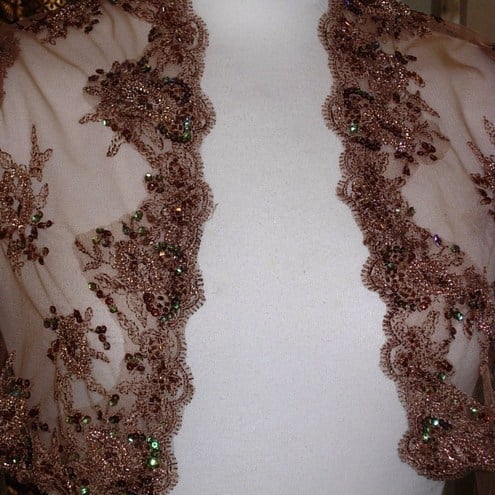 The tulle is a chocolate/coffee colour. The beading uses predominantly foiled light coffee coloured beads with glistening emerald green, two tone, faceted sequins and embroideries.