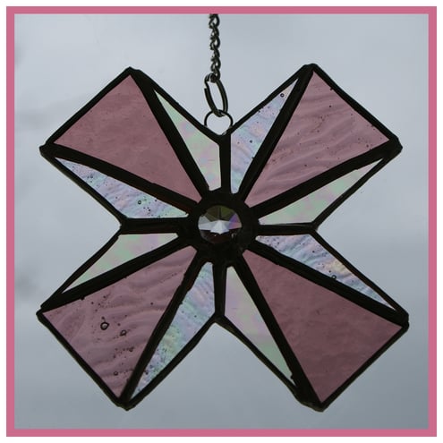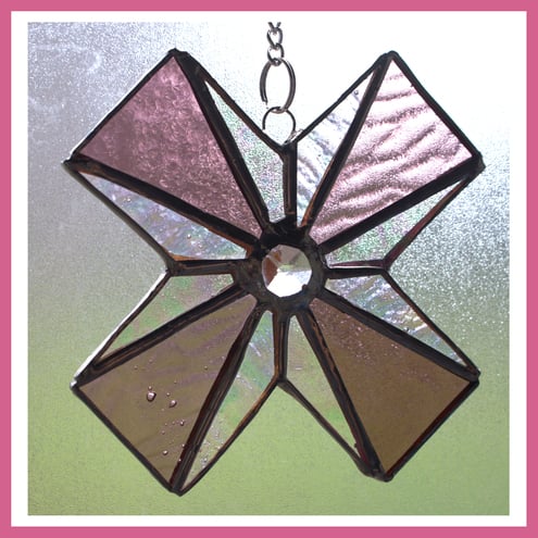 The four main pieces are of 2 types of lovely Rosy Pink glass and I have used two different types of textured clear iridescent glass for the side. This gives a three dimensional effect and together with the central crystal makes it very sparkly indeed.