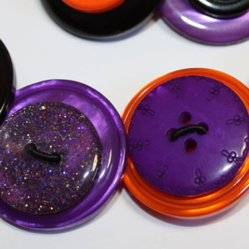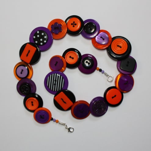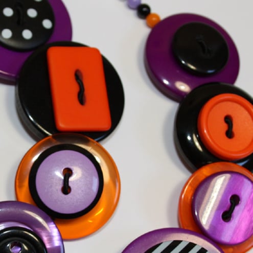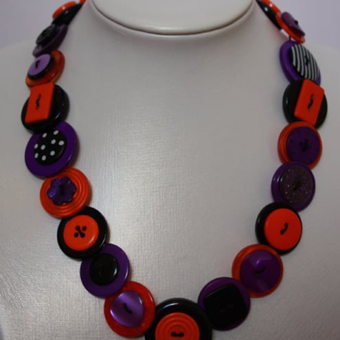 This distinctive button necklace is rich with an assortment of orange, black and purple coloured buttons.