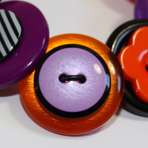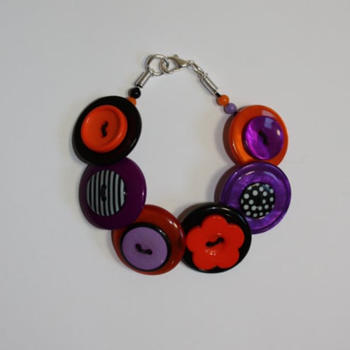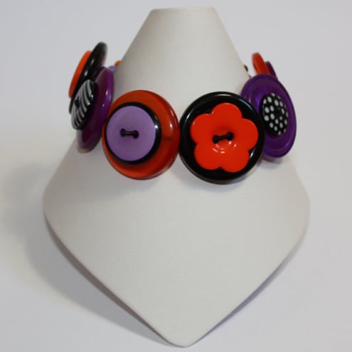 This distinctive button bracelet is rich with an assortment of orange, black and purple coloured buttons.