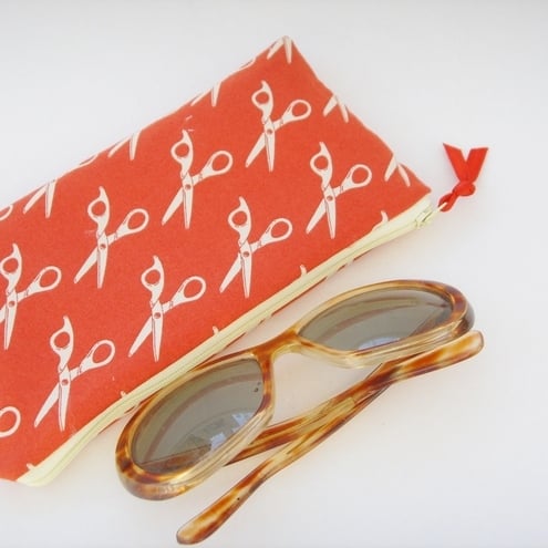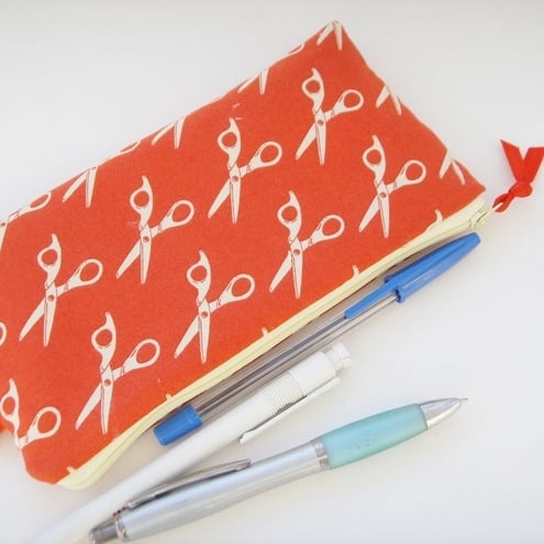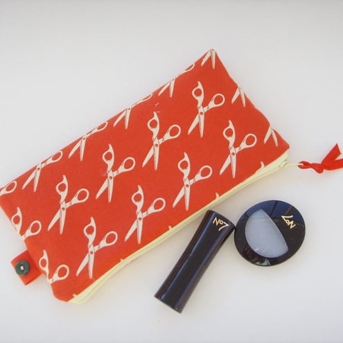Cute little red scissors make up bag / pencil case with contrasting zipper, ribbon and lining