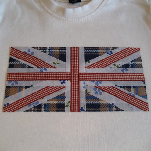 High quality soft white organic cotton T-shirt decorated with applique shabby chic style union flag. Materials include organic plaid brushed cotton, floral cotton and red gingham ribbon.