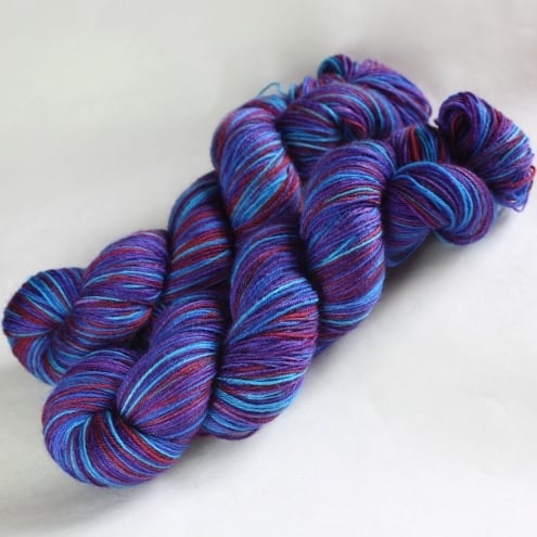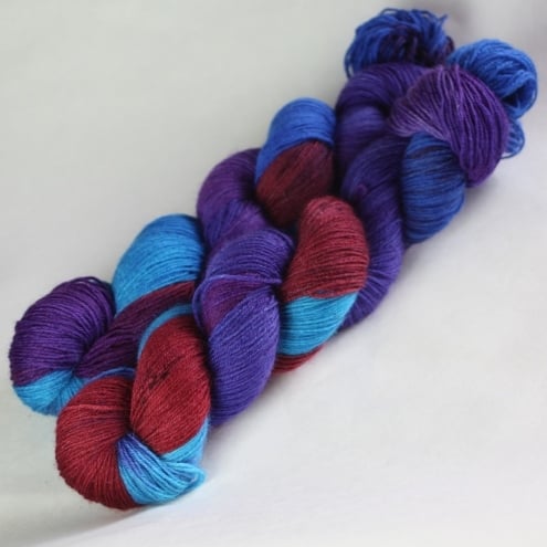 Shades of burgundy, purple, turquoise and blue. This British Bluefaced Leicester superwash yarn is soft with a very slight lustre. The yarn has been reskeined as shown in the first two photographs, but is shown in the third photo before reskeining for reference only. There is one skein left.