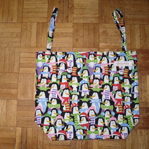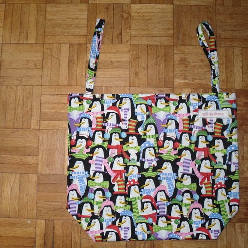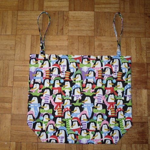 This penguin print bag would make a great present for a friend, or even for yourself ! A 100% cotton fabric tote, which is ideal for shopping, or could be used to carry your current knitting project! The bag measures w18.25" x h15.5" with a gusset of 6" and strap length of 17".