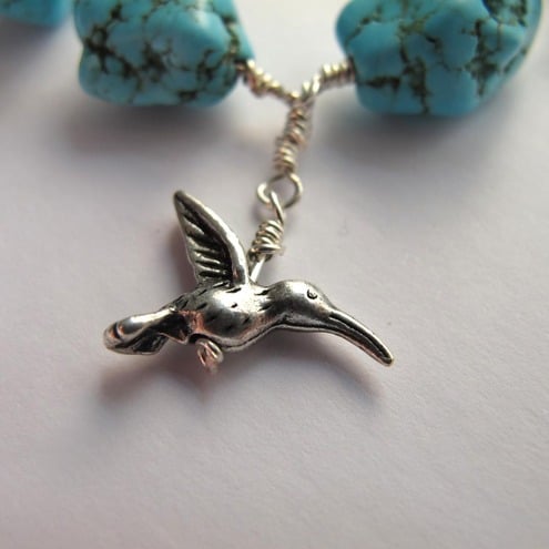 One off handmade bracelet constructed from semi-precious, irregular turquoise beads and silver plated wire work. This bracelet measure 24cm and is finished with a lobster clasp. The tiny humming bird adds a delightful touch.