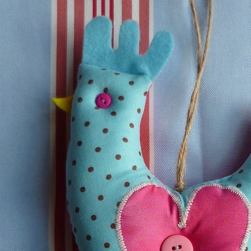 Here we have a blue spotty chicken decoration which has been designed and lovingly handmade by me.