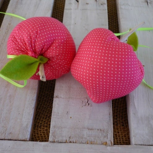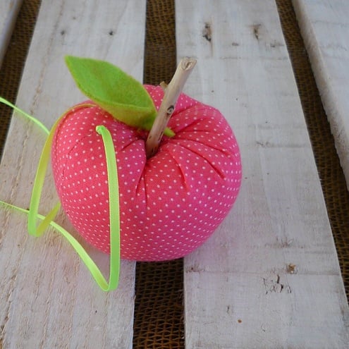 I have made it from pretty pink fabric with white pin dots. It has felt leaf and hangs from satin ribbon.