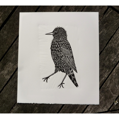 This is an original lino print printed with oil-based inks onto BFK Rives paper. It features one of the glossy starlings that visit our peanut feeder everyday.