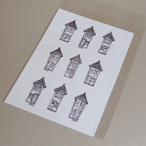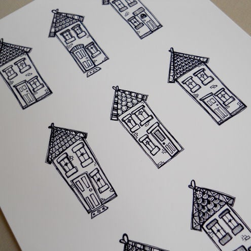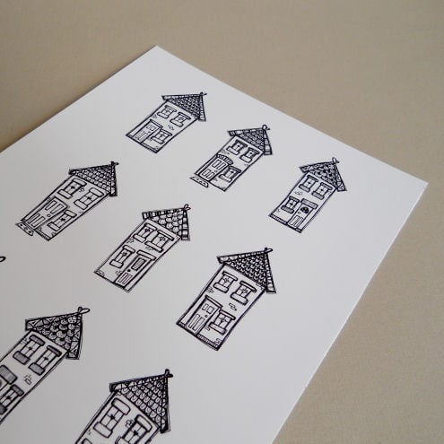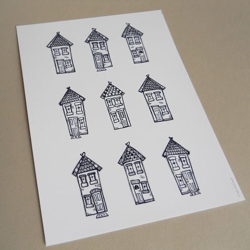 this quirky black and white print features my original hand drawing of 9 little crooked houses, with wonky windows, wooden doors, and detailed pan tile roofs!