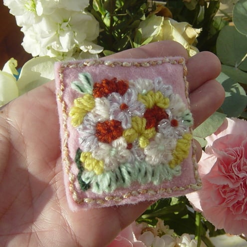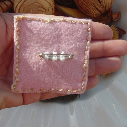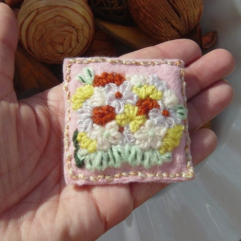 Floral Scene Brooch is an embroidered yarn and felt brooch, featuring embroidery, on a double layer of pale pink felt, which is then wrapped around a piece of flexible stiff card, and edged with golden toned yarn stitching to frame the brooch and to ensure minimal cotton and yarn workings can be seen from behind.