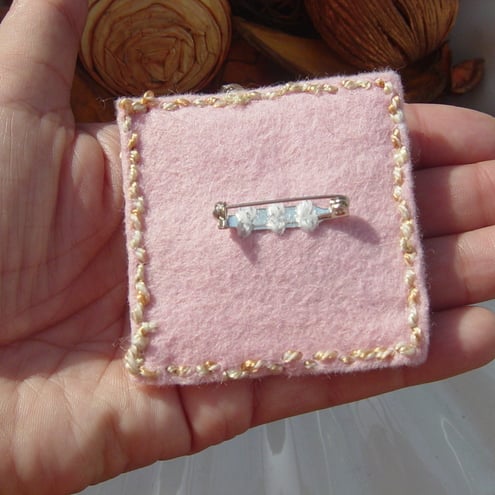 A silvertone, roll over pin mechanism has been securely sewn to the back of the item, so the brooch can be worn with peace of mind, that it should not dislodge itself from your garment.
