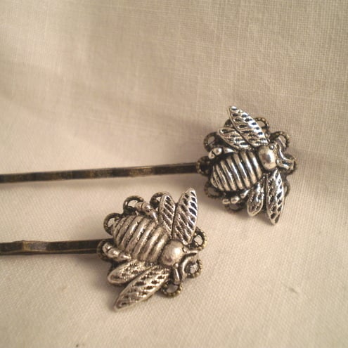 A cute pair of Bumble Bee silver tone hair pins/grips. A fun way to accessorize your hair.