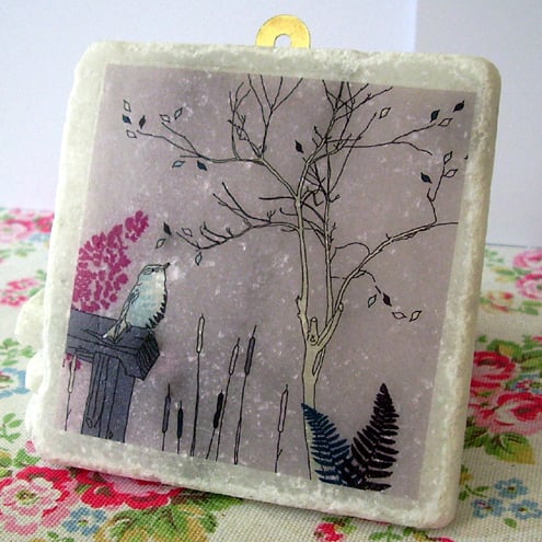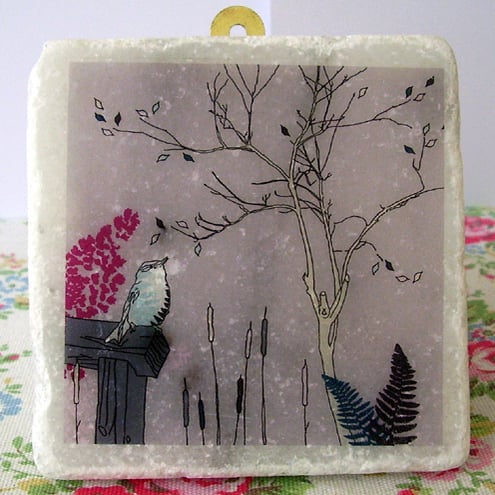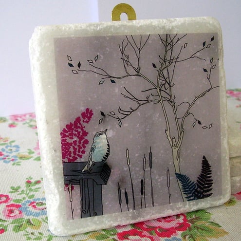 white marble tile featuring an original 'littlebirdy' design to hang on your wall!