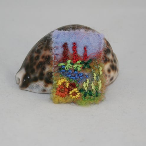 The back of the brooch has been neatened with commercial felt. It has been stiffened by a layer of interfacing. A brooch pin is securely stitched in place. The first of a series, each one unique - both in background and embroidered detail.
