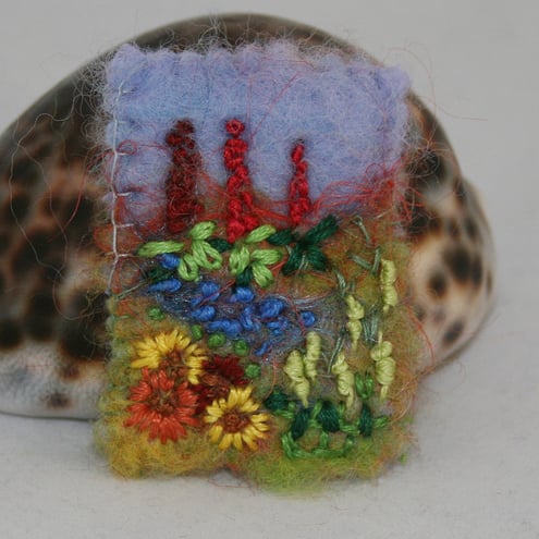 A small, needle-felted panel has been embroidered with a profusion of flowers to form the summer garden design for this brooch.