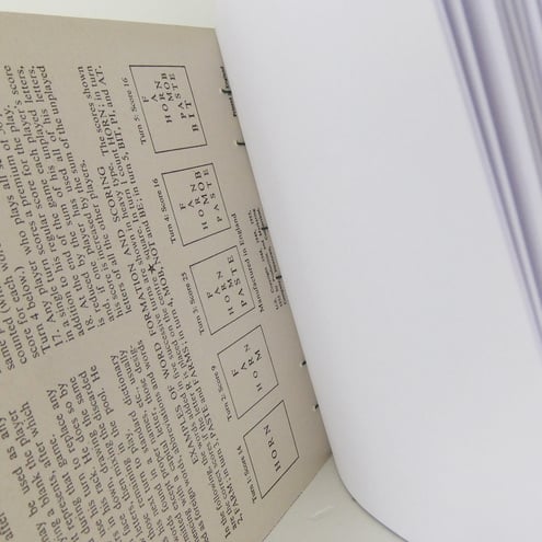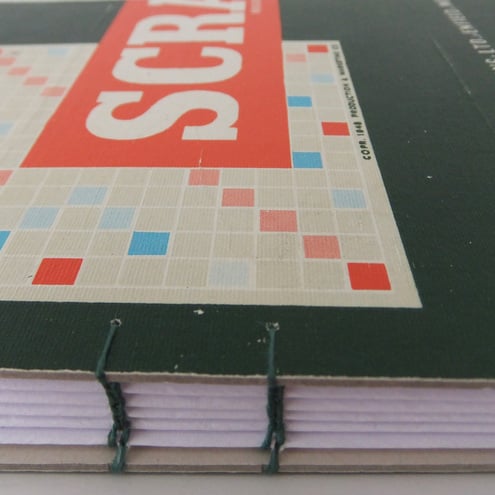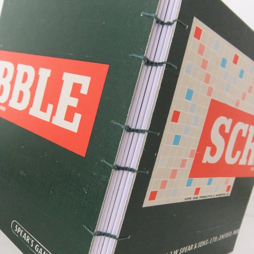 This handmade notebook has been made from the box of a vintage Scrabble game. The outside cover is the outside of the box lid while some of the game’s rules can be seen on the inside cover.