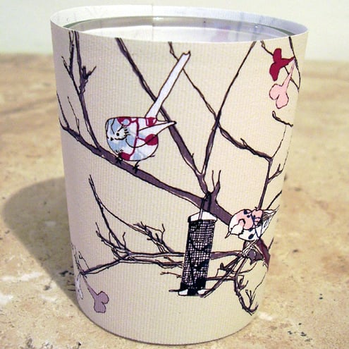 My original littlebirdy designs have been printed onto fire retardant, washable fabric which is then wrapped around a glass tealight holder.