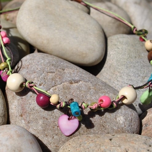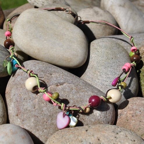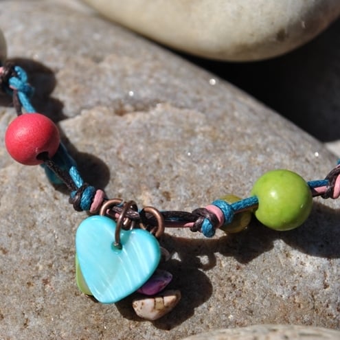 Multi-colour cord necklace with river shell, coco, tagua and wooden beads, featuring a blue river shell heart. Tagua beads are made from plant seed pods.