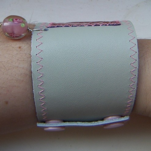 Wristlet made from stone recycled leather, with embossed and stitched pink aluminium floral embellishment, and pretty bead dangle. Raw stitched edge and fastened with pink professional poppers.