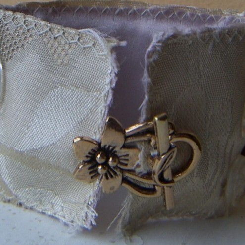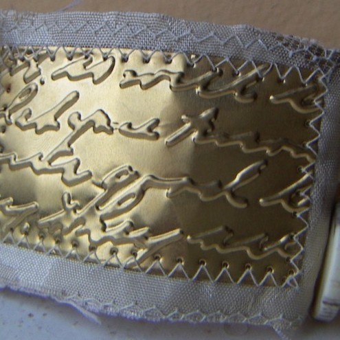 Wristlet made from cream cotton damask, with embossed and stitched weathered brass love letter embellishment, vintage buttons and brass tone fastening. Raw stitched edge and lined with oyster satin.