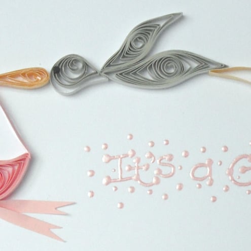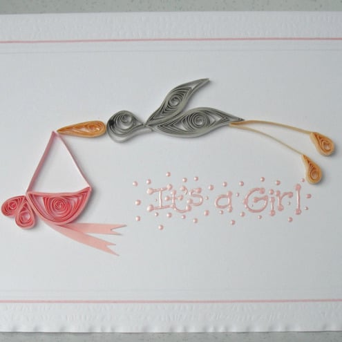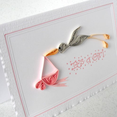 A quilled new baby girl congratulations card with a stork made in quilling.