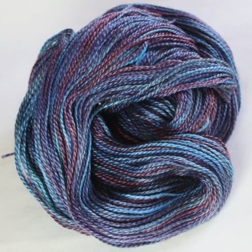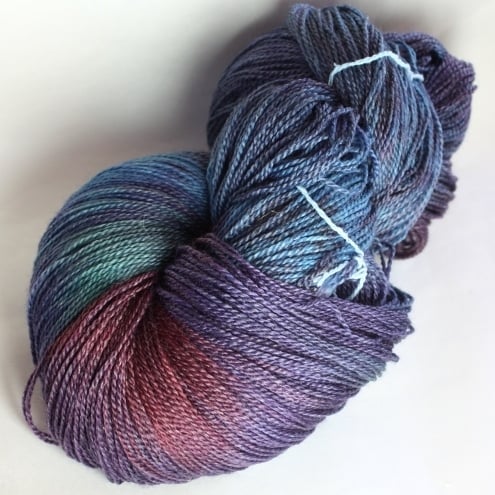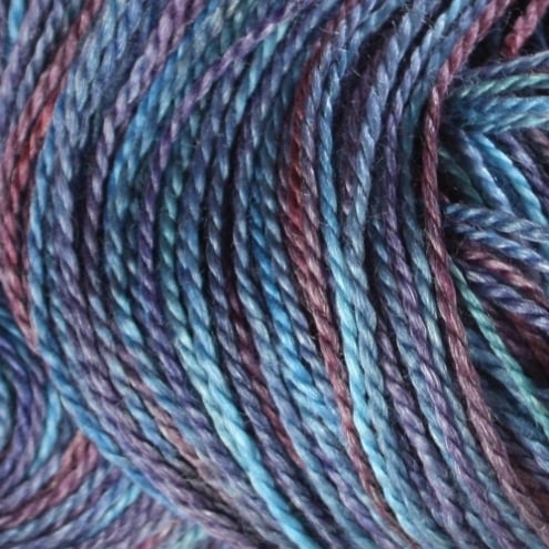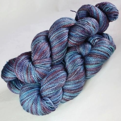 LImited edition merino and seacell, roughly sock-weight yarn in shades of blue, purple and burgundy with a little