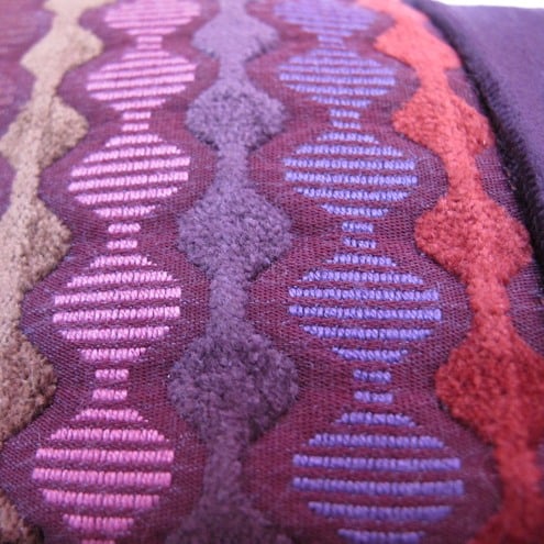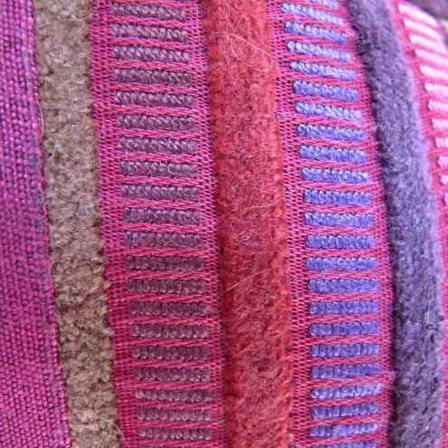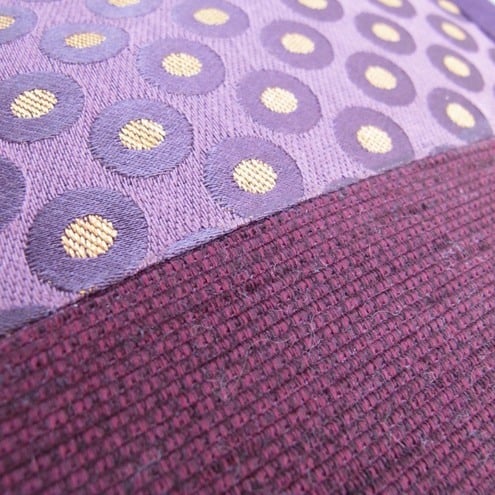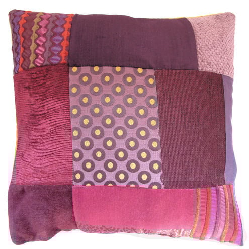 I lovingly and (painstakingly!) created this vibrant cushion from several sections of luxurious upholstery fabric in tones of purple, pink, gold and red.