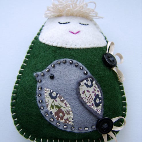 This is a custom order for 1 x babushka doll in green felt with bird detail. Filled with polyester stuffing.