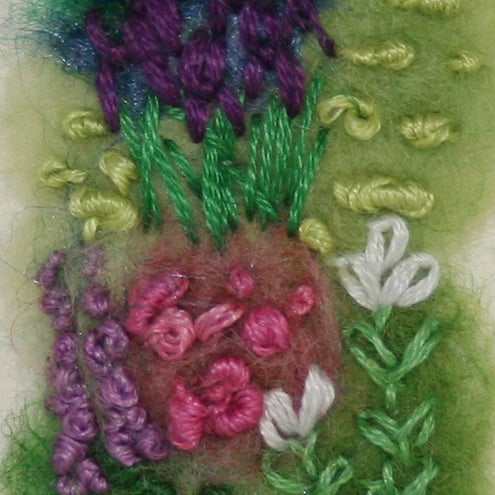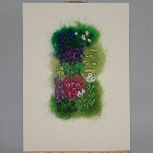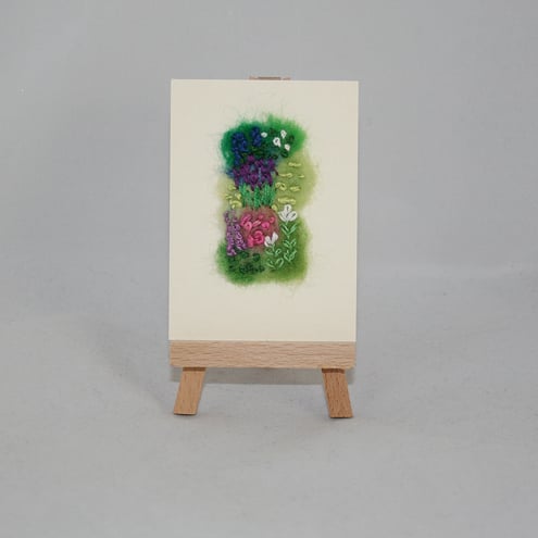 A panel of needle felting forms the background for this design. Flowers, stitched in embroidery threads, give colour and texture. Simple embroidery stitches are used including - straight stitch, French knots, bullion knots and daisy stitch. They depict lillies, irises, roses and foxgloves The embroidered panel is then tacked to the ACEO background, formed of textured board.