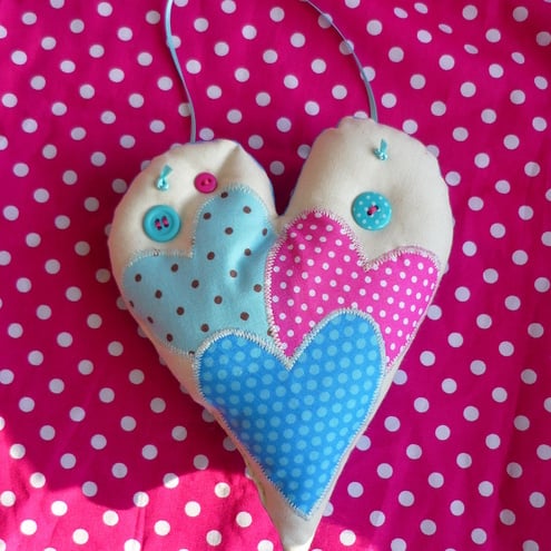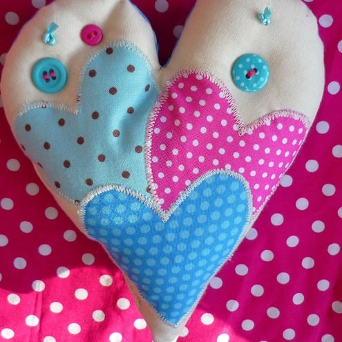 There are 3 applique hearts in different fabrics and brightly coloured button decorations. The reverse is blue spotty fabric.