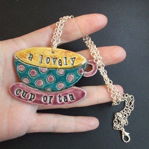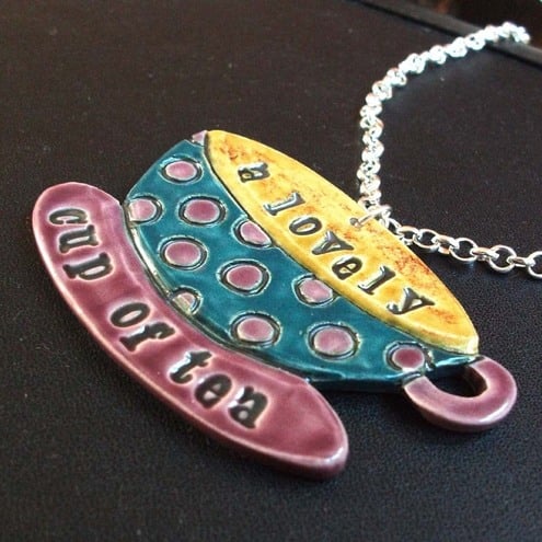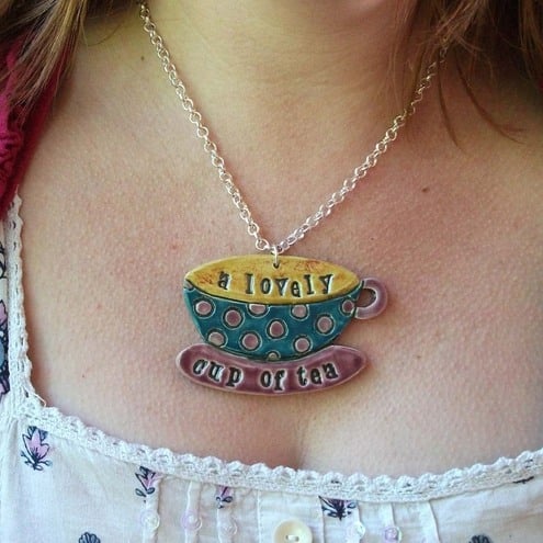 Then you need this funky ceramic teacup necklace made from white earthenware clay, etched, stamped and glazed.