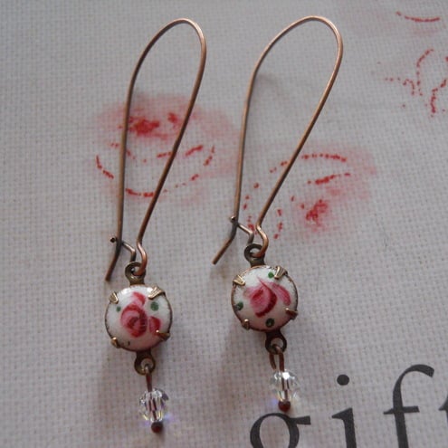These are so sweet and very shabby chic. Set in vintage brass. They have a pink and green vintage enamel floral guilloche cab. They are a real find and quite rare. You can have them with a double or single cab, just let me know when ordering.