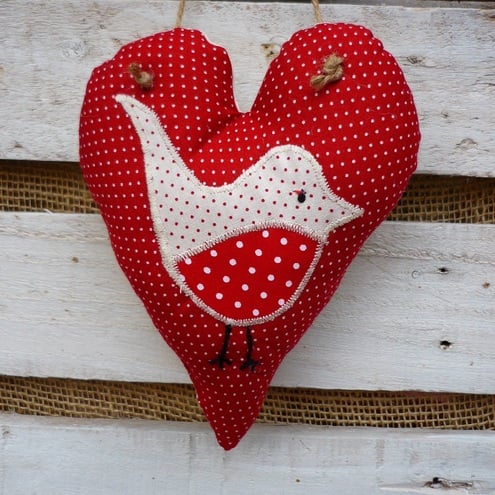 Here we have a hanging heart decoration with an applique robin which has been designed and lovingly handmade by me.