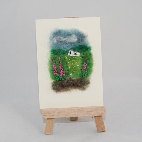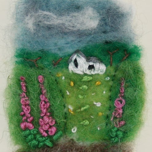 A panel of needle felting forms the background for this design. Flowers, stitched in embroidery threads, give colour and texture. Simple embroidery stitches are used including - straight stitch, French knots, bullion knots and daisy stitch. They depict foxgloves, distant daisies and buttercups, and the farm.The embroidered panel is then tacked to the ACEO background, formed of textured board.
