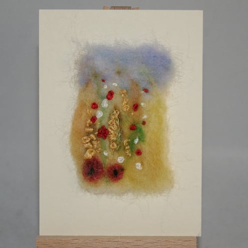 A panel of needle felting forms the background for this design. Flowers, stitched in embroidery threads, give colour and texture. Simple embroidery stitches are used including - straight stitch, French knots, bullion knots and daisy stitch. They depict distant daisies ears of corn and poppies. The embroidered panel is then tacked to the ACEO background, formed of textured board.