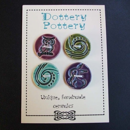 This set of four buttons are made from white earthenware clay, embossed and glazed to 1100 degrees, so nice and strong.