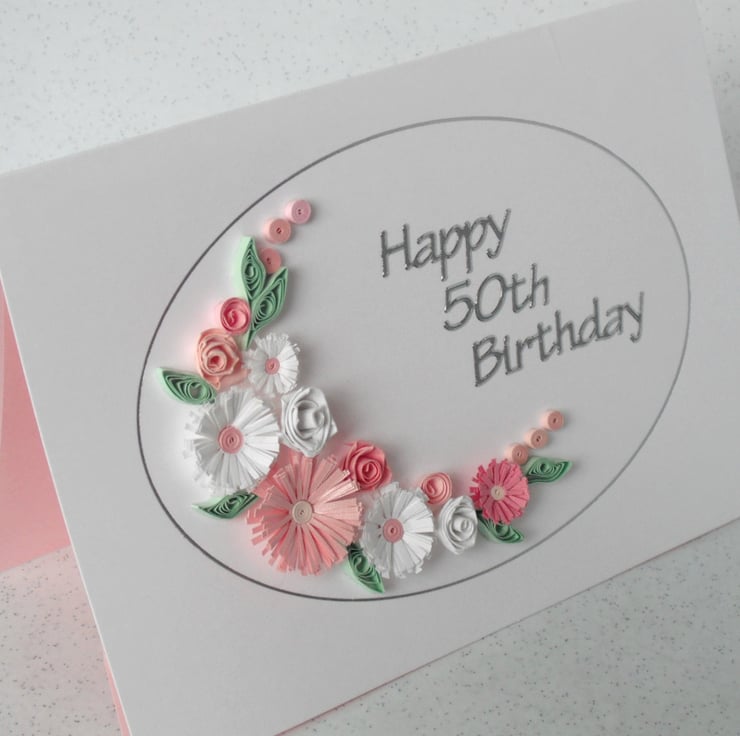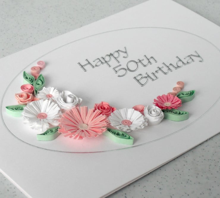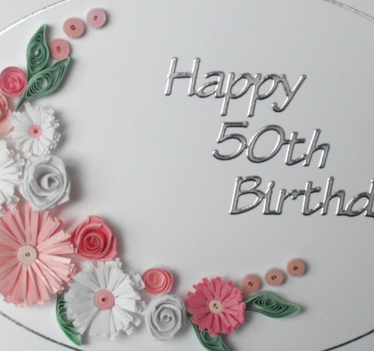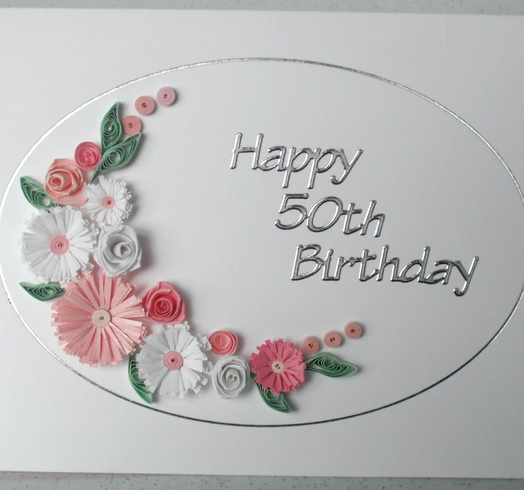 A beautiful quilled 50th birthday card with quilling flowers in coordinating shades of pink and white, perfect for sending birthday wishes to friend or family.