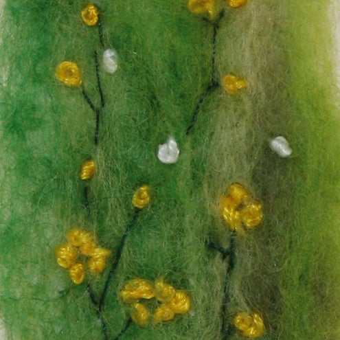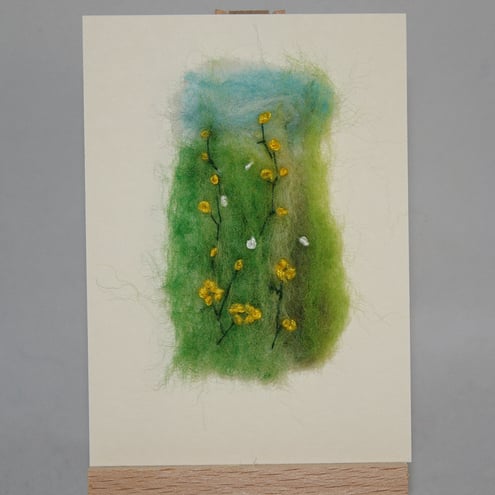 A panel of needle felting forms the background for this design. Flowers, stitched in embroidery threads, give colour and texture. Simple embroidery stitches are used to depict distant daisies and buttercups in the foreground. The embroidered panel is then tacked to the ACEO background, formed of textured board.