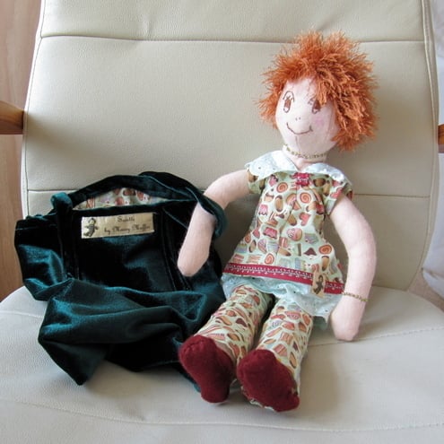 Soucette just loves sweets and cakes - so much so that her whole outfit and the lining of her pretty green velvet carry bag are covered in them.