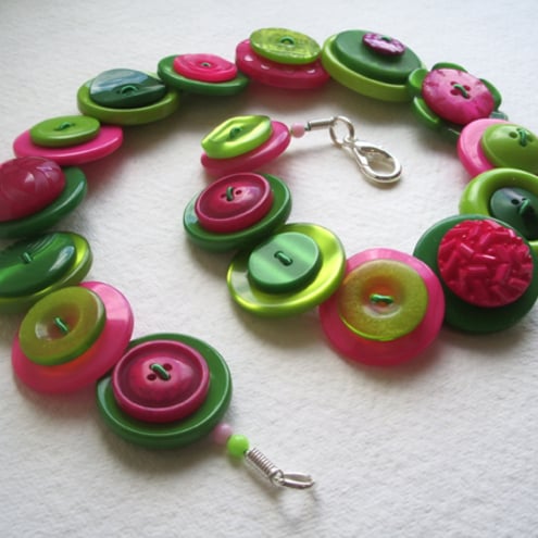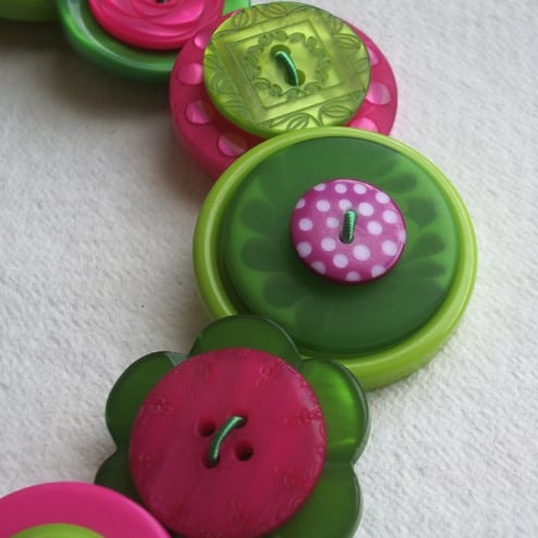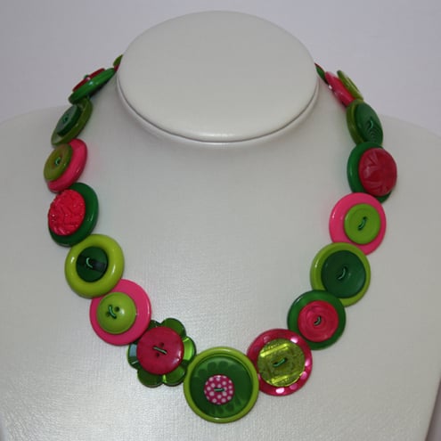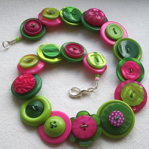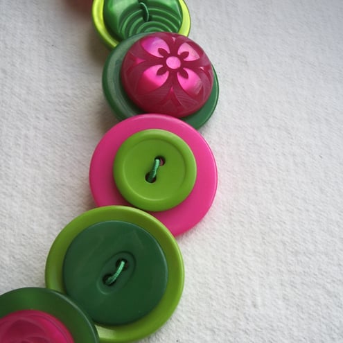 This distinctive button necklace is rich with an assortment of lime, hot pink and green coloured buttons