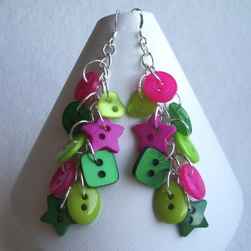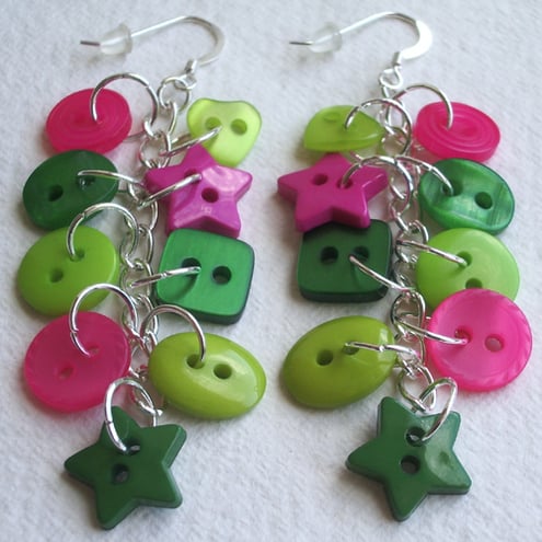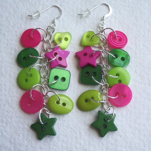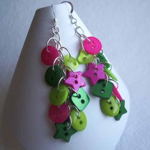 1 x Lime, hot pink and green button sterling silver drop earrings.