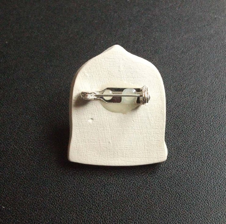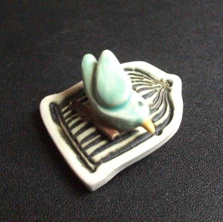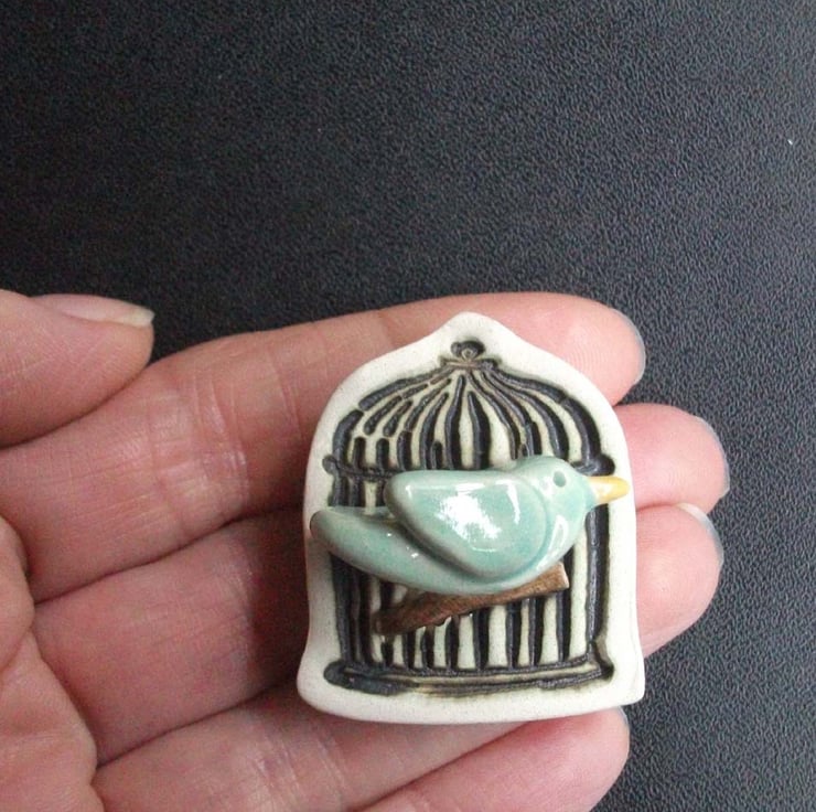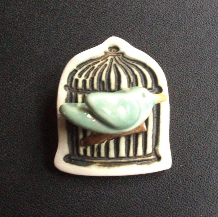 This cute little bird cage brooch is made from white earthenware clay and twice fired to a top temperature of 1100 degrees.