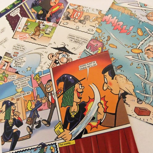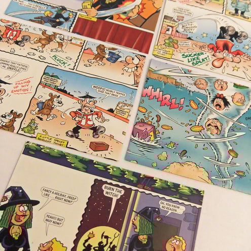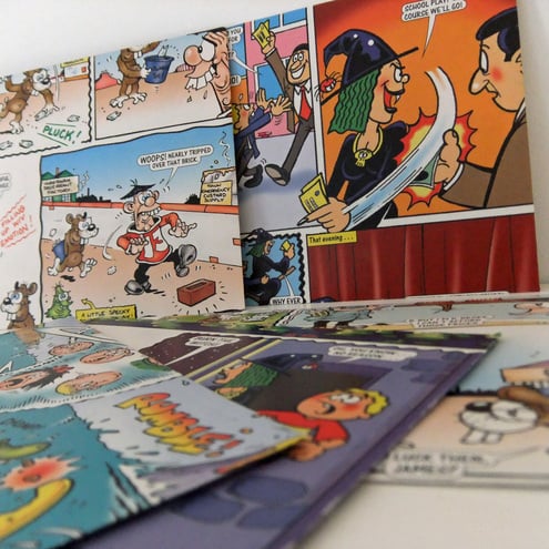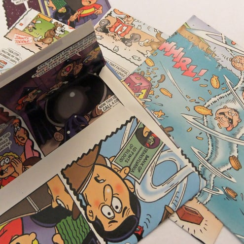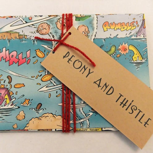 This is a set of 5 very colourful envelopes showing characters from the Beano, including Calamity James and Freddie Fear. They have been made from a rescued Beano annual.