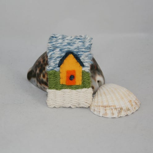 The background for this brooch has been woven from a selection of cotton, wool and mixed fribre yarns. The beach hut has been appliqueed onto the brooch and the roof and door knob added in a further contrasting yarn. The brooch is stiffened by a layer of heavy interfacing. The back is neatened with commercial felt and a brooch pin is securely stitched in place.