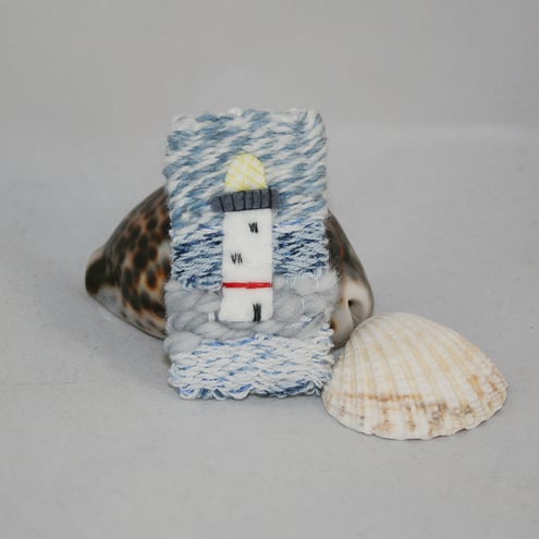 The background for this brooch has been woven from a selection of cotton, wool and mixed fribre yarns. The light house has been appliqueed onto the brooch and details added with embroidery. The brooch is stiffened by a layer of heavy interfacing. The back is neatened with commercial felt and a brooch pin is securely stitched in place.